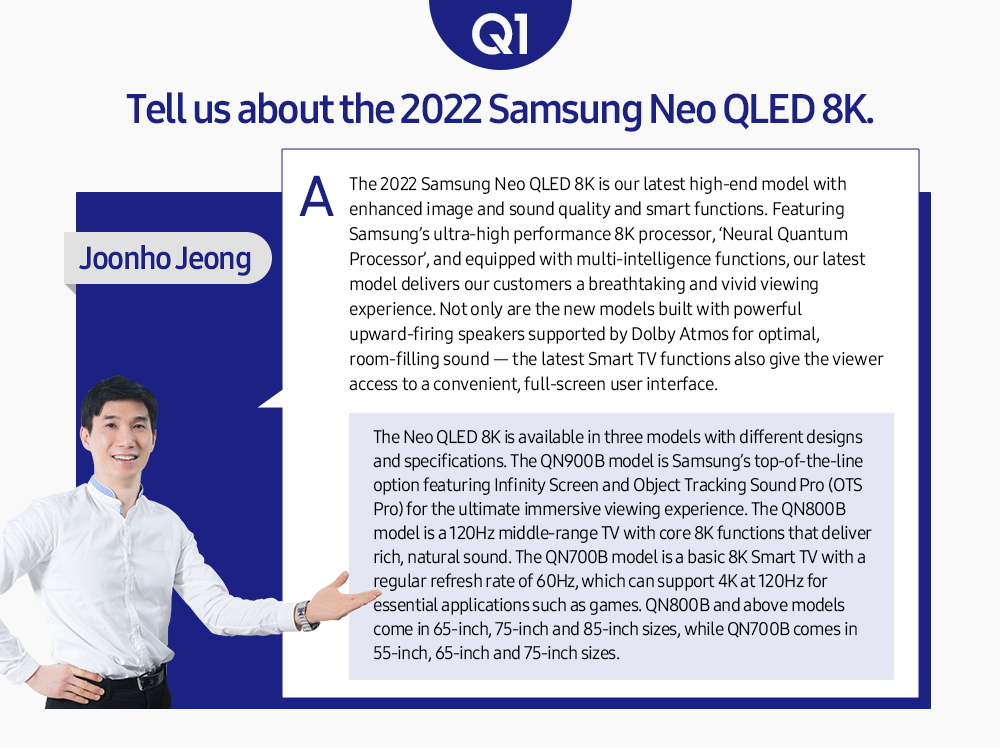 Samsung Newsroom hat sich mit Ingenieur Uihyun Kim und Produktplaner Joonho Jeong zusammengesetzt, um ihnen acht Fragen zu Samsungs neuestem 8K-Fernseher zu stellen, der die Grenzen dessen, was mit einem Fernseher möglich ist, erweitert. Nachfolgend können Sie ihre Antworten lesen.