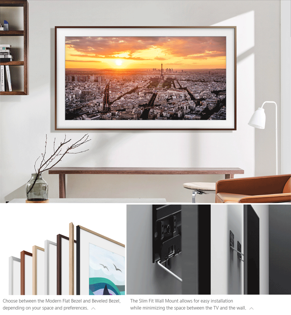 Das Zubehör, das The Frame von Samsung, das über eine Bilderrahmenverkleidung verfügt, die Weltklasse-Kunst direkt an Ihrer Wand zeigt, den letzten Schliff verleiht, ist eine anpassbare Lünette. Um in Ihrem Zuhause genau den Look zu erzielen, den Sie sich wünschen, können Sie zwischen mehreren Farboptionen wechseln. Sie können aus den Modern Flat Lünetten wählen, die in Weiß, Teak und Braun für einen sauberen und modernen Look erhältlich sind, oder Sie können sich für eine der abgeschrägten Lünetten entscheiden, die in Weiß und Ziegelrot für ein traditionelleres Design erhältlich sind. 2 Darüber hinaus minimiert die Slim Fit-Wandhalterung den Platz zwischen Ihrem Fernseher und Ihrer Wand, um sich nahtlos in jeden Raum einzufügen.