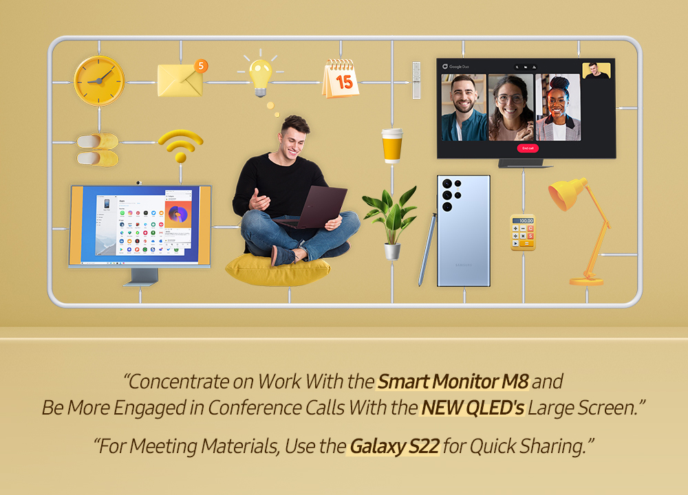 Durch #YouMake können Sie den Tag beginnen, indem Sie in Ihrem Arbeitszimmer mit Ihren arbeiten SmartMonitor M8, aber betreten Sie dann mit Ihrem das Wohnzimmer für eine Telefonkonferenz Neo-QLED-Fernseher. Das große Display vermittelt ein Meeting-Feeling. Sie können die Agenda und die Gesichter Ihrer Kollegen leicht erkennen. Materialien, die während des Meetings geteilt werden müssen, können Sie schnell über Ihr teilen Galaxy S22.
