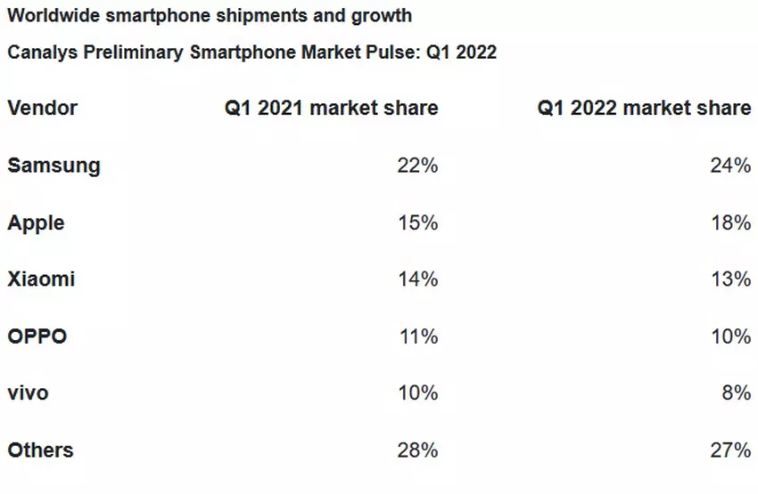 Von Jahr zu Jahr bleibt die Führung von Samsung unverändert: Der Anteil des südkoreanischen Herstellers lag im ersten Quartal bei 24 %, ein Plus von 2 % gegenüber dem gleichen Zeitraum im Jahr 2021. Samsung hat die Produktion seiner beliebten A-Serie hochgefahren, um im Mittelklasse- und Budgetsegment aggressiv zu konkurrieren, und sein Portfolio für 2022 um die Flaggschiff-Serie Galaxy S22 erweitert, sagten Analysten.