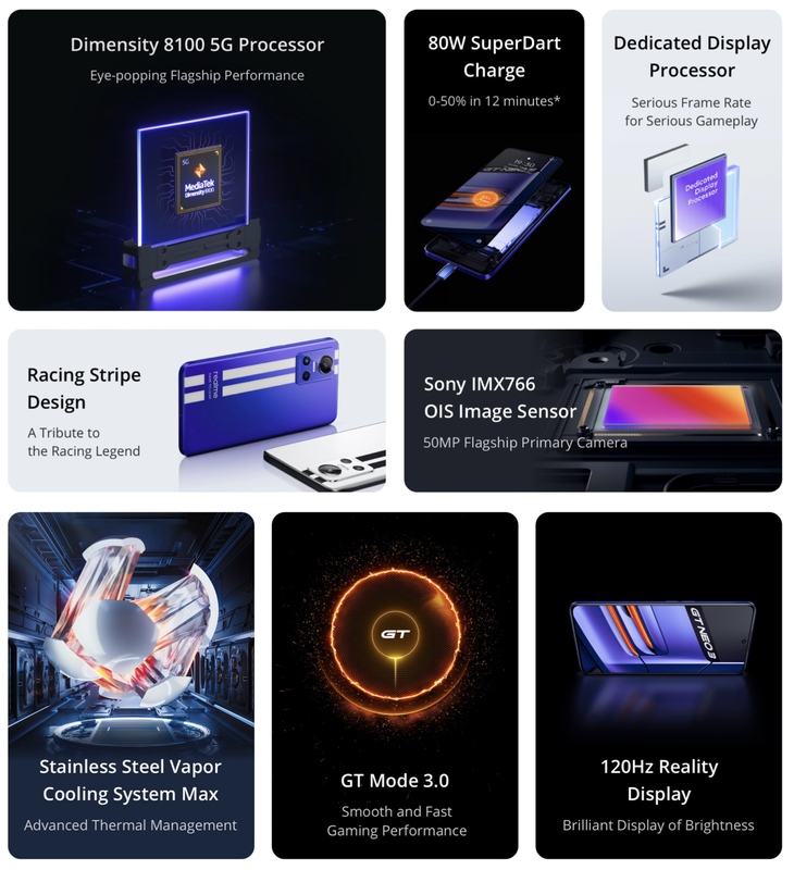 Die globale Version des Smartphones erhielt wie die chinesische zwei Modifikationen. Ersteres ist mit einem 5.000-mAh-Akku und 80-W-Schnellladung ausgestattet, während letzteres mit einem 4.500-mAh-Akku und 150-W-Schnellladung ausgestattet ist. Das Gerät ist mit einem 6,7-Zoll-AMOLED-Display mit einer Bildwiederholfrequenz von 120 Hz ausgestattet. Außerdem erhielt die Neuheit einen 5-Nanometer-Chip MediaTek Dimensity 8100, bis zu 12 GB RAM, bis zu 256 GB ROM und eine dreifache Hauptkamera mit 50 MP + 8 MP + 2 MP. Die Front wiederum hat einen 16-MP-Sensor.