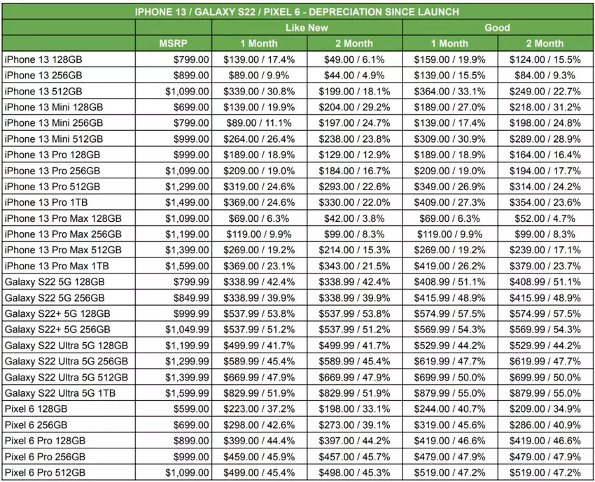 Gleichzeitig war unter den Apple-Smartphones das iPhone 13 mini das Schlimmste, das 29,2 % seines Wertes verlor. Aber das 128 GB iPhone 13 Pro Max verlor nur 3,8 % in 2 Monaten.