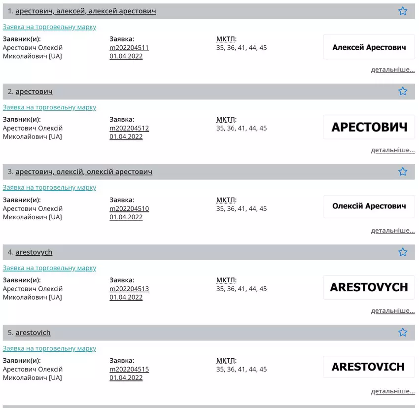 Gemessen an den Daten aus dem Register des Ukrainischen Instituts für geistiges Eigentum (Ukrpatent) reichte Arestovich Anträge auf Registrierung solcher Marken ein: Oleksiy Arestovich, Oleksiy Arestovich, Arestovich, Arestovych, Arestovich, Apeiron ( der Name der Schule für persönliches Wachstum) , "Apeiron", "Die Kunst des Denkens und Sprechens" (der Name von Arestovichs Kurs über persönliches Wachstum), "Die Kunst des Denkens und Sprechens".