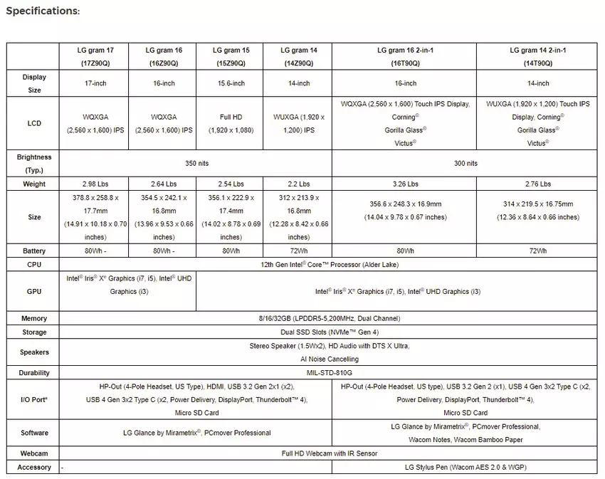 Ab heute sind alle sechs Modelle der Familie, einschließlich des Gram 15 und der 14- und 16-Zoll-Gram 2-in-1-Modelle, mit Intels neuen Alder-Lake-Chips ausgestattet. Darüber hinaus können Sie die Laptops jetzt mit bis zu 32 GB DDR5-RAM mit 5.200 MHz konfigurieren. Ebenfalls neu in der Produktpalette ist die Unterstützung für PCIe-Gen-4-NVMe-SSD-Laufwerke, wobei die gesamte Familie zwei Speichersteckplätze bietet.