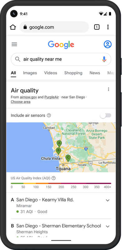 Die Informationen basieren auf bekannten Regierungsbehörden, einschließlich der Environmental Protection Agency in den Vereinigten Staaten (EPA). PurpleAir ist ein kostengünstiges Sensornetzwerk, das Ihnen einen hyperlokalen Überblick über die Bedingungen geben kann, und seine Karten zeigen Luftqualitätsdaten. Um diesen Luftverschmutzungs-Layer in Ihre Karte aufzunehmen, berühren Sie die Schaltfläche in der oberen rechten Ecke des Bildschirms Ihres Telefons und wählen Sie dann Luftqualität unter Kartendetails aus. Die Daten von PurpleAir können auch auf Nest-Displays und -Lautsprechern angezeigt werden.