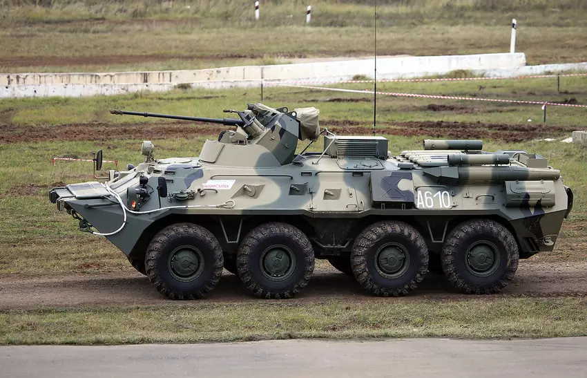 Der BTR-82A verfügt über ein einheitliches Modul mit einem Waffenstabilisierungssystem, das hier durch eine 30-mm-2A72-Schnellfeuerkanone dargestellt wird. Der konventionelle BTR-82 verwendet ein 14,5-mm-KPVT-Maschinengewehr. Die Waffe wird durch ein Kalaschnikow-Maschinengewehr ergänzt.