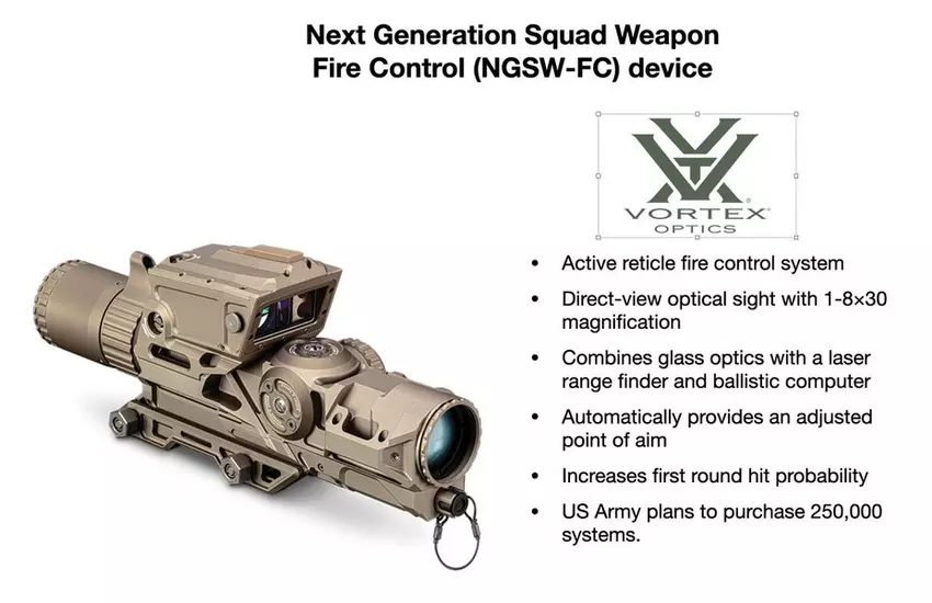 Da es sich um eine Ausschreibung handelte, nahmen neben Vortex auch andere Hersteller daran teil. Sie haben auch computerisierte Visiere in einem All-in-One-Format entwickelt und werden sie natürlich anderen Armeen anbieten oder auf den zivilen Markt bringen. Darüber hinaus werden Europäer und Asiaten ihre Armeen auch mit Kleinwaffen mit "intelligenten" Visieren bewaffnen wollen. Daher wird das Angebot an computergesteuerten Zielfernrohren und deren Fähigkeiten exponentiell wachsen.