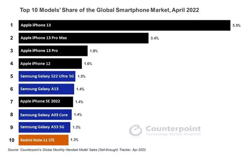 Geschlossen die Top Ten der meistverkauften Smartphones im April 2022-Modelle Samsung Galaxy A53 5G und Redmi-Hinweis 11 pro Chip Löwenmaul 680 ohne 5G-Modem. Der Anteil betrug jeweils 1,3 %. Damit belegten die zehn beliebtesten Telefone insgesamt mehr als 20 % des Marktes.