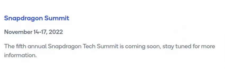 Termine für den nächsten Snapdragon Summit sind auf der Website von Qualcomm erschienen. Es zeigt normalerweise einen neuen Chip. Laut Zeitplan ist mit der Bekanntgabe vom 14. bis 17. November zu rechnen. Übrigens, nach einiger Zeit wurden die Daten entfernt. Höchstwahrscheinlich hat sie jemand aus Versehen gepostet.