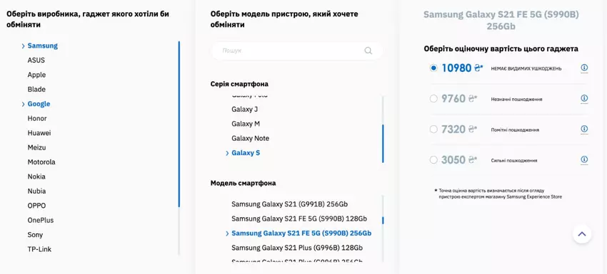 Eine Vorabbeurteilung der zu übergebenden Geräte können Sie auf der Website unter vornehmen spezieller Rechner. Es hilft bei der Bewertung von Apple- oder Samsung-Smartwatches, Apple-, Samsung- und Lenovo-Tablets, aber es gibt ein paar Dutzend Smartphone-Hersteller. Ältere Modelle von Samsung-Smartphones beginnen mit dem Galaxy S5 und Galaxy Note 4. Wenn das Gerät nicht aufgeführt ist, sollten Sie sich trotzdem an einen der Network Stores wenden Samsung Experience Store. Um das Austauschverfahren abzuschließen, benötigen Sie einen Reisepass und einen Identifikationscode.