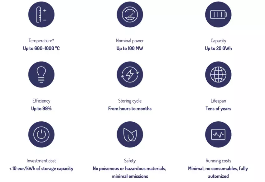 Dabei handelt es sich um ein thermisches Energiespeichersystem, das einen riesigen, isolierten Stahltank - etwa 4 Meter breit und 7 Meter hoch - verwendet, der mit gewöhnlichem Sand als Wärmespeicher gefüllt ist. Diese Anlage kann 8 Megawattstunden Strom bei einer Nennleistung von 100 kW speichern, während der Sand auf etwa 500-600 Grad Celsius erhitzt wird.