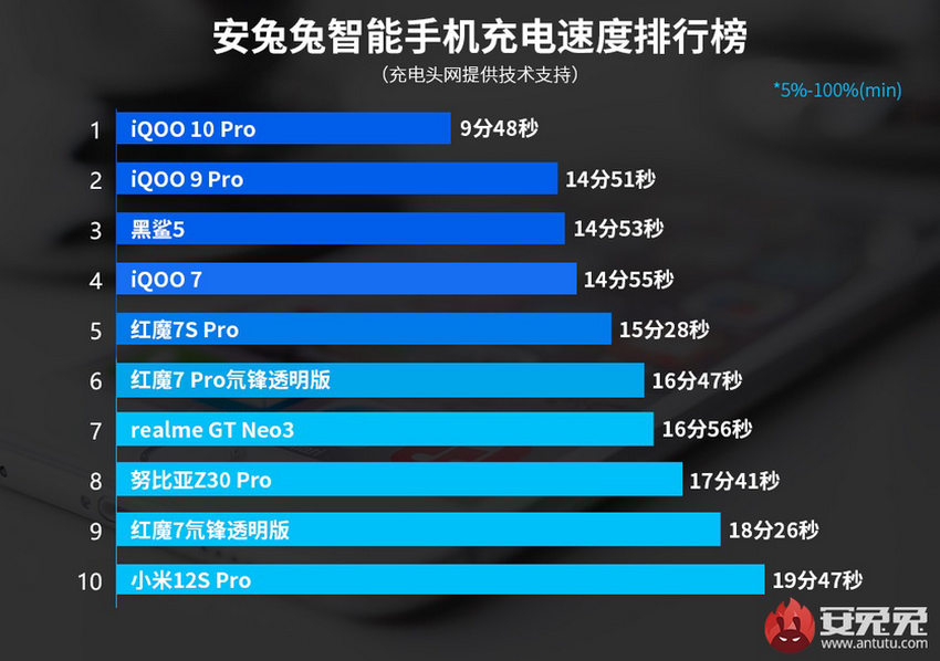 Das neue Ranking scheint mit der Ankündigung des iQOO Modells Pro zusammenzufallen, das als erstes in der Welt 200W Schnellladung unterstützt. Laut Hersteller lädt das Smartphone in 10 Minuten auf. AnTuTu sagt, dass es 9 Minuten und 48 Sekunden dauert.