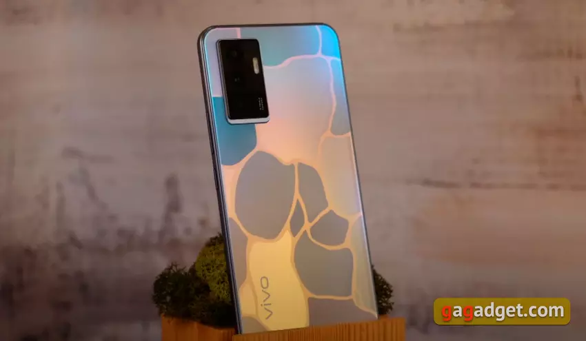 Der interessanteste Trick vivo V23 5G und V23e ist die hintere photochrome Glasscheibe, die ihre Farbe ändert. Das gilt allerdings nicht für die "langweiligen" schwarzen Varianten. Die Variante Sunshine Gold hat eine schöne samtige Oberfläche und einen goldenen Farbton in Innenräumen. In der Sonne oder unter einer UV-Lampe ändert es jedoch seine Farbe in ein Blaugrün. Dies ist möglich dank der speziellen Beschichtung der Flourite AG. das vivo V23 5G hat eine solide Rückseite: