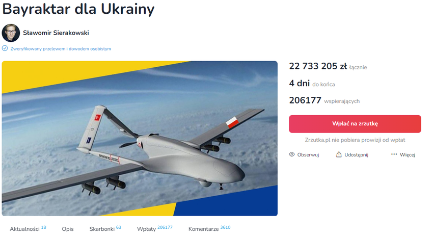 Die Spendenaktion für das türkische unbemannte Luftfahrzeug Bayraktar TB2 für die ukrainischen Streitkräfte wurde in Polen beendet. Die Plattform zrzutka.pl sammelte in vier Tagen vor Ende der Crowdfunding-Kampagne fast 23.000.000 Zloty oder 4 900 000 Dollar.