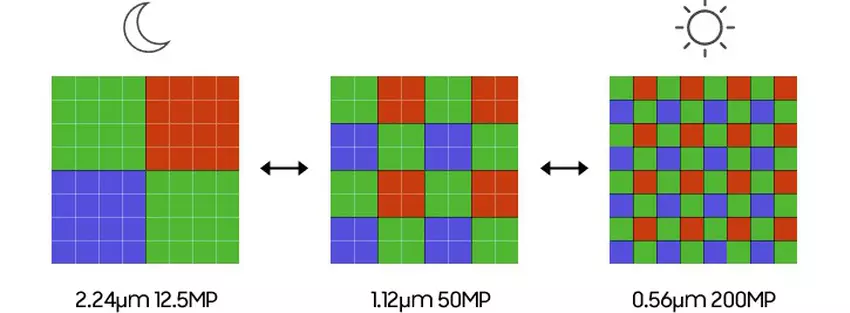 Beide HP-Sensoren verfügen über "Tetra²pixel"-Farbfilter, die ihnen ein 4x4- und 2x2-Pixel-Binning für 12MP- bzw. 50MP-Ausgaben ermöglichen. Angesichts des Namens des neuen Sensors "²" wird er höchstwahrscheinlich zwei Ausgabemodi haben. 6x6 und 3x3 sind möglich. Wenn dies der Fall ist, kann er Bilder mit einer Auflösung von 12 MP bzw. 48 MP erzeugen. Ein Binning wäre erforderlich, denn selbst wenn der Sensor groß genug ist, würden so viele Pixel auf einer kleinen Fläche unbedeutend erscheinen.