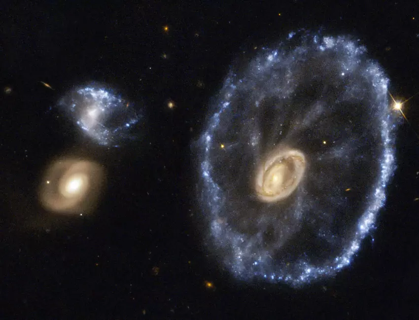 Die Cartwheel-Galaxie befindet sich im Sternbild Sculptor in etwa 500 Millionen Lichtjahren Entfernung und entstand durch die Kollision einer kolossalen Spiralgalaxie mit einer winzigen Galaxie (die inzwischen aus dem Blickfeld verschwunden ist). Die kleinere Galaxie erzeugte Schockwellen, die Gas und Staub anhoben und einen Welleneffekt erzeugten, ähnlich dem, wenn man einen Stein in die Mitte eines Sees wirft.
