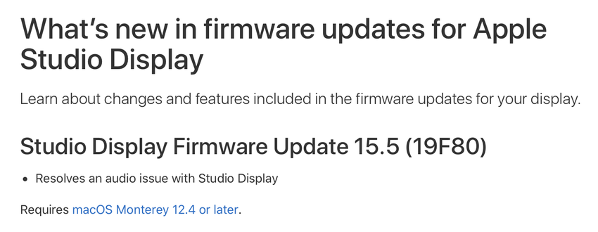 Das Update wurde mit der Build-Nummer 19F80 veröffentlicht. Laut der offiziellen Liste der Änderungen haben die Entwickler endlich ein Problem mit den Lautsprechern des Geräts in der Software behoben. Dieses Problem bestand bereits seit der Einführung von Studio Display im März.