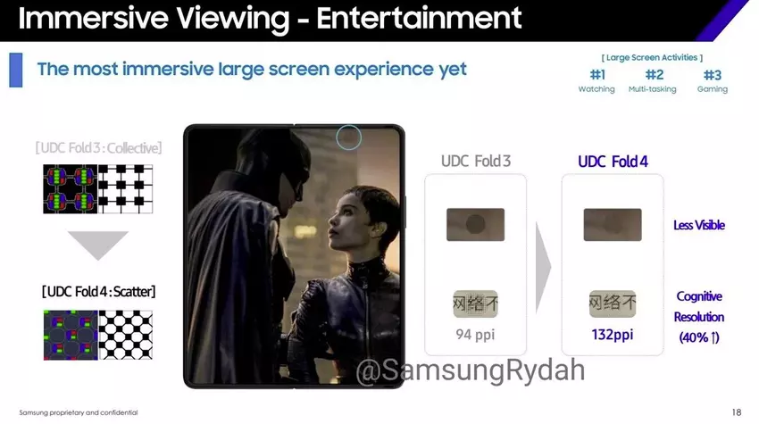 Den durchgesickerten Folien zufolge wird das Modell eine andere Pixelanordnung verwenden, um den Bildschirm dichter zu machen, was zu einem 132 ppi-Kreis anstelle der 94 ppi des Galaxy Z Fold 3 führt. Dadurch sollte das Loch weniger auffällig und der Text in diesem Bereich weniger zackig sein. Den durchgesickerten Folien nach zu urteilen, ist sie leider nicht völlig unsichtbar.