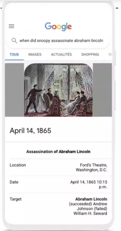 Und auf die Frage "Wann hat Snoopy ein Attentat auf Abraham Lincoln verübt?" folgte die Antwort "1865". Das ist zwar das richtige Datum für Lincolns Tod, aber Lincoln wurde nicht von einem fiktiven Hund aus einem Cartoon getötet.