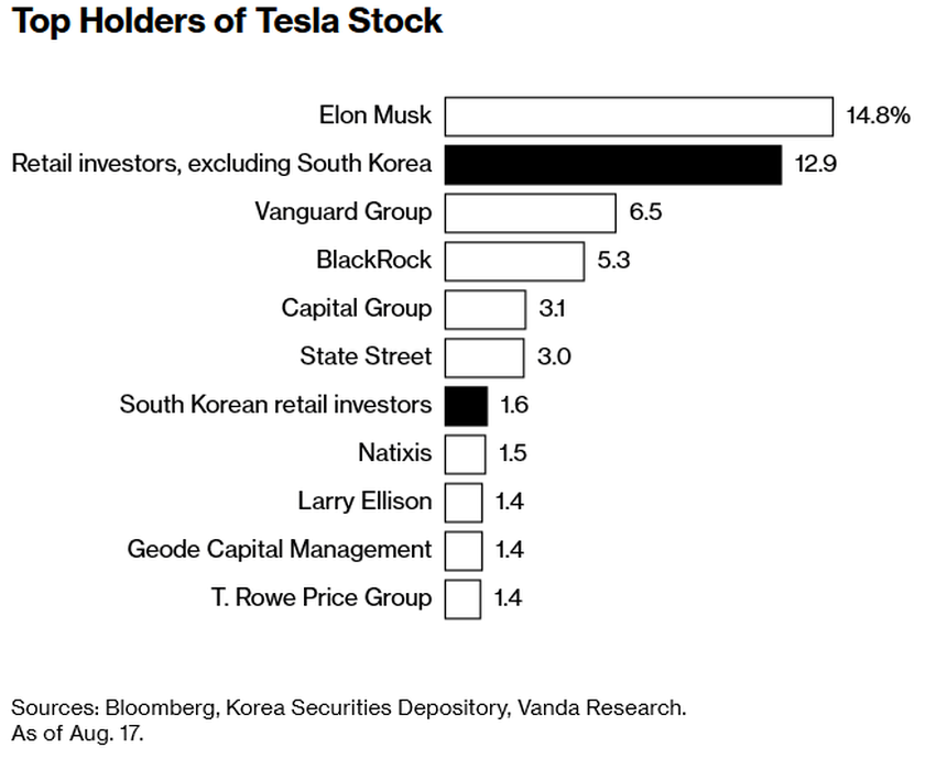 Beachten Sie, dass Investoren aus Südkorea zu den zehn größten Inhabern von Teslastock gehören. Einwohner der Republik kauften 1,6 % der Wertpapiere im Wert von mehr als 15 Milliarden Dollar. Zum Vergleich: Der ehemalige CEO von Oracle , Larry Ellison, besitzt 1,4 % der Aktien.