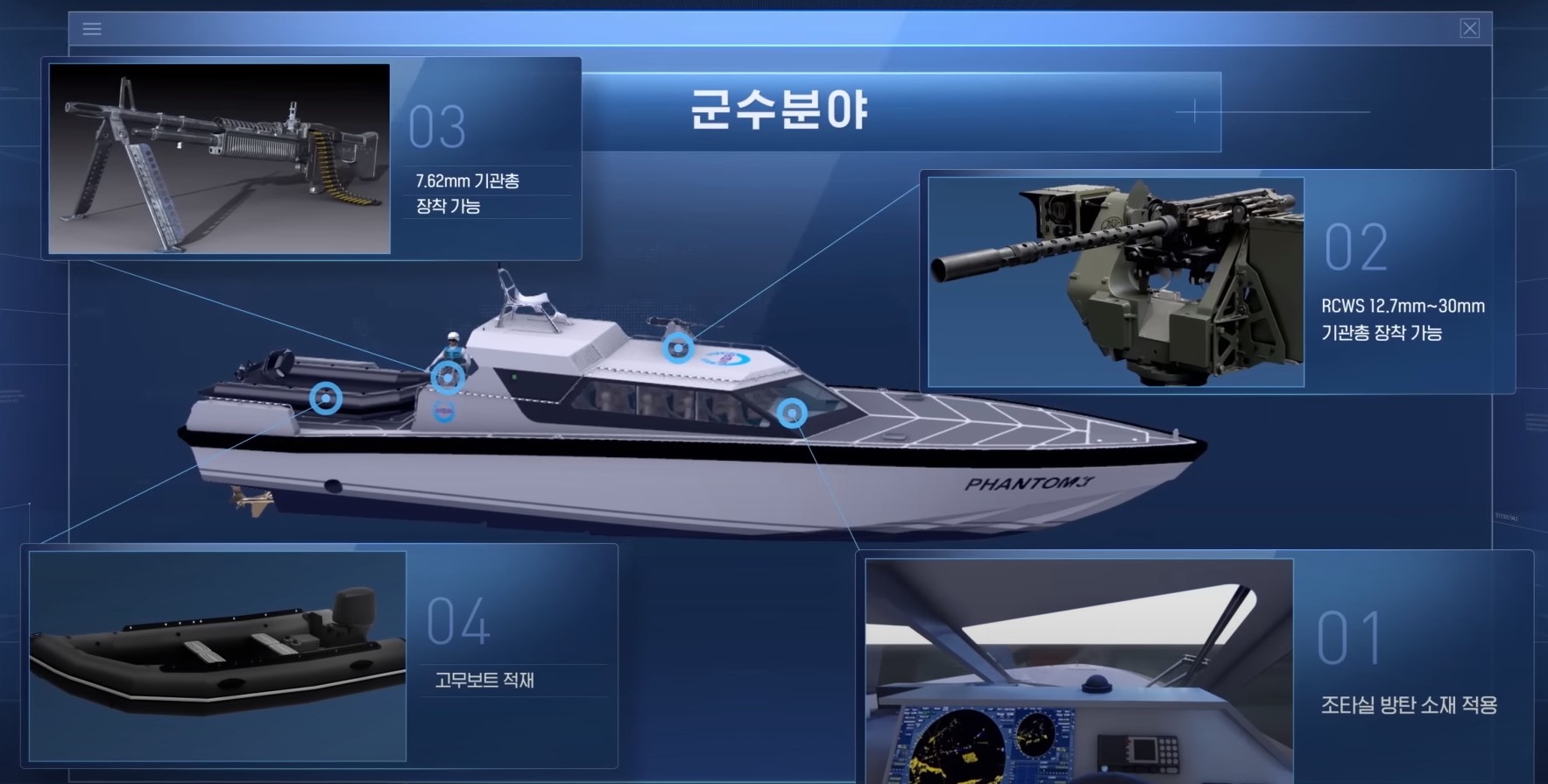Waffentechnisch wird sie mit einem 7,62-mm-Maschinengewehr und einem RCWS ausgestattet sein. Die Phantom wird für Patrouillen und den Transport von Kampftruppen eingesetzt. Es ist noch nicht bekannt, wann das Boot in Südkorea in Dienst gestellt werden soll.