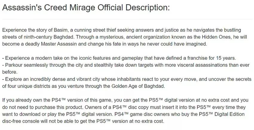 Außerdem heißt es in der Beschreibung, dass Käufer der PS4-Version von Assassin's Creed Mirage die PS5-Version kostenlos erhalten, wenn sie auf eine moderne Konsole umsteigen. PS5-Besitzer ohne Disc-Laufwerk, die Mirage auf einer PS4-Disc gekauft haben, werden jedoch nicht kostenlos upgraden können.