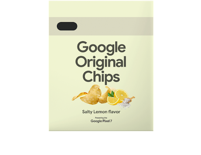Dabei handelt es sich um Chips in limitierter Auflage mit einer Verpackung, die das Design der Rückseite des Pixel 7 und Pixel 7 Pro mit einem Streifen und Löchern für die Kamerasensoren nachbildet. Insgesamt gibt es vier Geschmacksrichtungen, die zu den Farben der Smartphones passen. Sie sind weiß "Schneekäse", grün "nussige Zwiebel", gelb "salzige Zitrone" und schwarz "obsessiver Pfeffer". Wir wissen nicht, wie sie schmecken, aber die Namen sind verlockend.