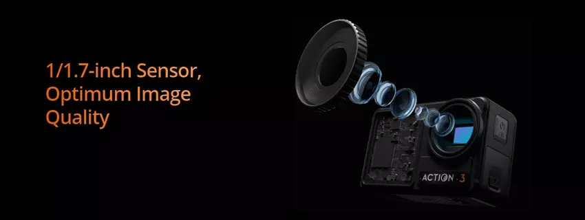 DJI Osmo Action 3 hat einen optischen 1/1,7"-Sensor mit 12 MP Auflösung. Die Kamera hat ein Objektiv mit einem Blickwinkel von 155 Grad und einer Blende von f/2.8. Das Gerät kann 4K ULTRA HD Videos mit einer Bildrate von bis zu 120 FPS aufnehmen und unterstützt die Stabilisierungstechnologien RockSteady 3.0 und HorizonSteady.