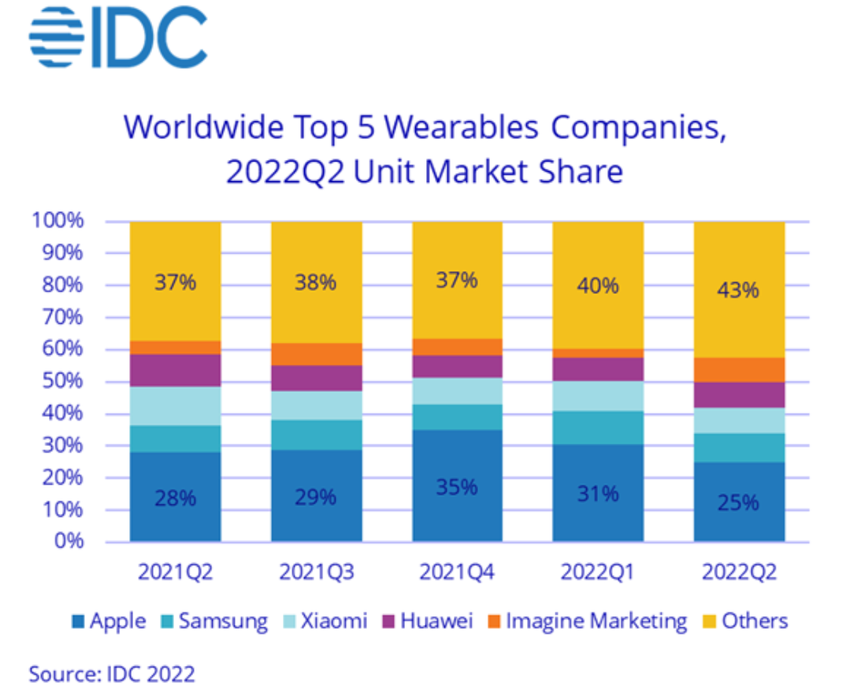 Das Analystenunternehmen IDC hat einen Bericht über seine Untersuchungen zum Markt für tragbare Elektronikgeräte von April bis einschließlich Juni veröffentlicht. Apple liegt mit einem Anteil von 25 % fest an der Spitze. Das sind 6 Prozent weniger als Anfang 2022 und 3 Prozent weniger als im zweiten Quartal 2021.