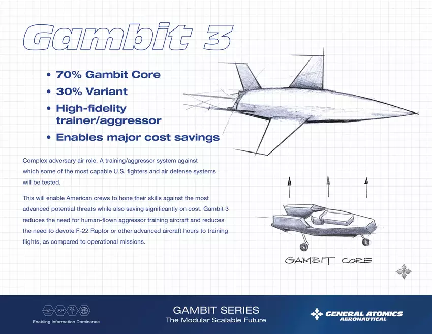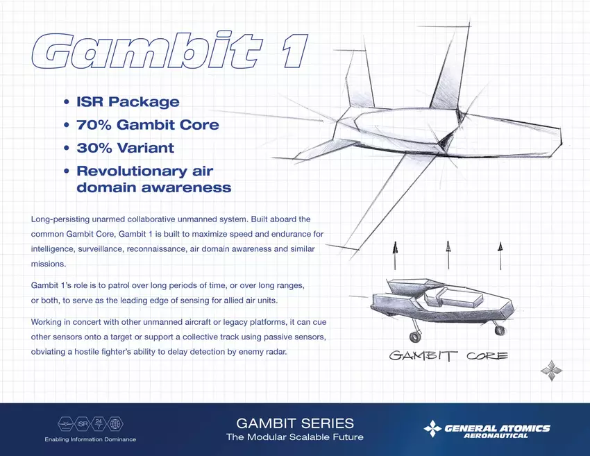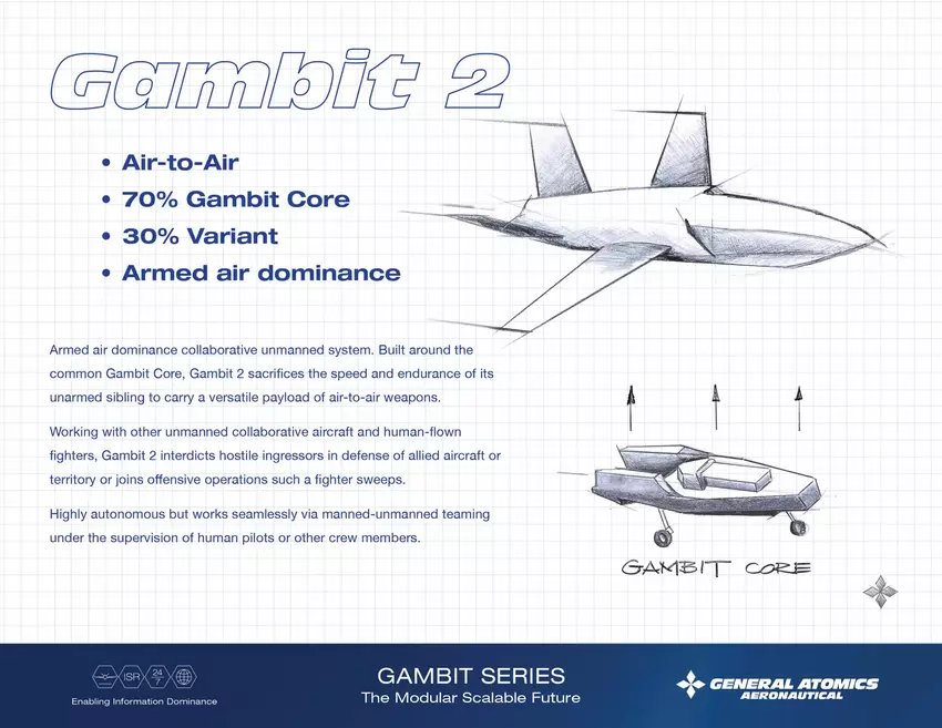 Das amerikanische Unternehmen General Atomics Aeronautical Systems kündigte eine Reihe von modularen Drohnen Gambit für den Einsatz mit bemannten Flugzeugen an.