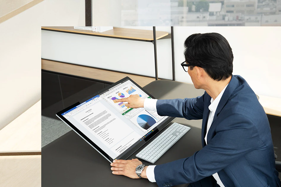 Das Display des Monoblocks basiert auf dem PixelSense-Panel mit Touchscreen-Steuerung. Der Bildschirm hat eine Diagonale von 28 Zoll, ein Seitenverhältnis von 3 zu 2, 4.500 x 3.000 Pixel und unterstützt Dolby Vision.