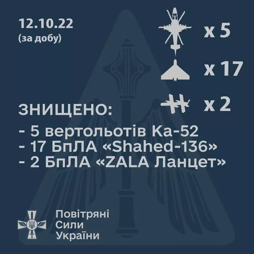 Am 12. Oktober konnte die Luftwaffe der Streitkräfte der Ukraine fast zwei Dutzend russische Drohnen und fünf Hubschrauber ausschalten.