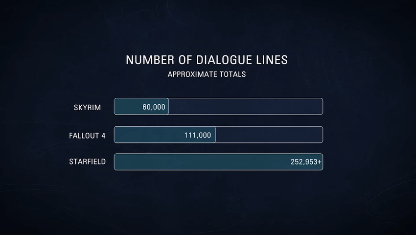 Sie sprachen auch über Dialoge. Sie werden den klassischen Bethesda-Spielen ähneln. Howard fügte hinzu, dass Starfield mehr als 250 Tausend Zeilen an Dialogen haben wird. Fallout 4 hatte zum Beispiel 110 Tausend Zeilen.