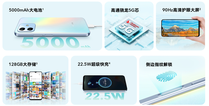 Die Neuheit ist mit einem 6,5-Zoll-Display mit IPS-Matrix, HD+-Auflösung, Seitenverhältnis 20:9 und einer Bildwiederholfrequenz von 90 Hz ausgestattet. An der Oberseite des Panels befindet sich eine tropfenförmige Aussparung mit einer 5 MP Frontkamera (f/2.2). Die Hauptkamera hat zwei Sensoren für 13 MP + 2 MP. Das Smartphone hat auch einen seitlichen Fingerabdruckscanner, einen Kopfhöreranschluss und einen 5000 mAh Akku mit 22,5W Ladeunterstützung.