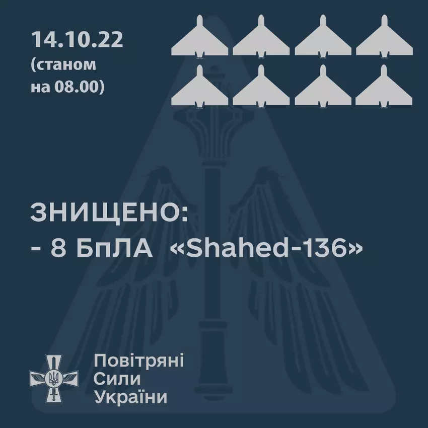 Ab 8.00 Uhr morgens hatten die ukrainischen Luftverteidigungskräfte acht iranische Kamikaze-Drohnen Shahed-136 in südlicher und östlicher Richtung abgeschossen. Fünf davon wurden von Flugabwehrraketen der Luftwaffe und drei von den Luftabwehrkräften der ukrainischen Marine zerstört.