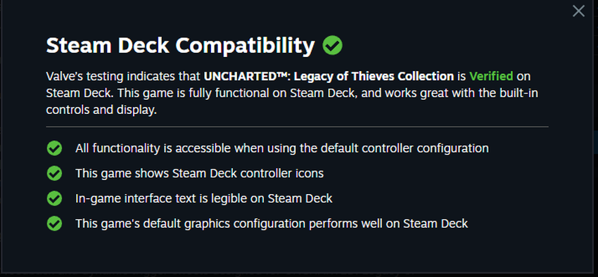 Auf Steam wird die Uncharted: Legacy of Thieves Collection, die Uncharted 4 und Uncharted enthält: The Lost Legacy, gibt es einen Hinweis darauf, dass die berühmten Actionspiele vollständig mit der tragbaren Konsole Steam Deck kompatibel sind. Dies bedeutet, dass die Kompilation keine zusätzlichen Einstellungen benötigt.