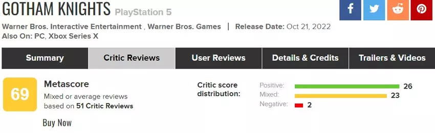 Den Bewertungen der Experten zufolge handelt es sich um ein durchschnittliches Spiel: Es löst weder Begeisterung noch Ablehnung aus. Die Bewertungen auf den Aggregatoren legen davon ein beredtes Zeugnis ab. Zum Beispiel hat die Version für PS5 die höchste Punktzahl auf Metacritic erhalten, und das sind nur 69 Punkte! Und die PC- und Xbox-Version von Gotham Knights erhielten 67bzw. 68 Punkte.