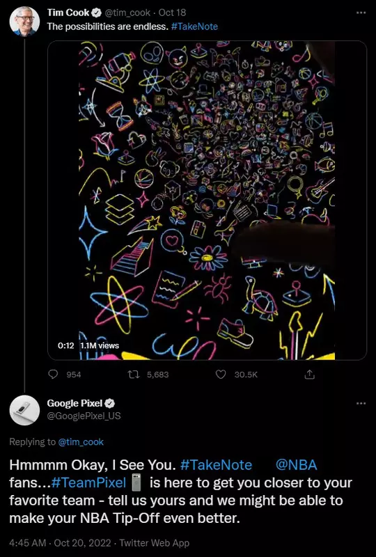 Google-Mitarbeiter hinterließen einen Kommentar unter Cooks Twitter-Post, in dem es um die neuen iPad Pro-Tablets mit M2-Prozessor ging. Sie beschlossen, die neuesten Pixel- und NBA-Modelle auf diese Weise zu bewerben. Allerdings verriet ihnen eine kleine Markierung "Twitter for iPhone", was darauf hindeutet, dass die Nachricht im sozialen Netzwerk von einem der Apple-Geräte aus veröffentlicht wurde.