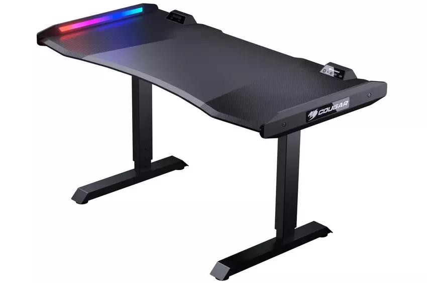 Der Tisch kann bis zu 150 kg tragen. Sie können einen schweren Computer, einen Ultrabreitbildmonitor, einen Laptop und eine ganze Reihe von Spielgeräten darauf stellen - und haben immer noch einen großen Sicherheitsabstand. Die Beschichtung der Tischplatte aus Kohlefaser (Carbon) lässt sie beeindruckend aussehen und ist abriebfest. Für schnelle Konnektivität gibt es ein paar USB-Typ-A-Anschlüsse, Audiobuchsen und eine RGB-Hintergrundbeleuchtung, die mit Ihrem PC synchronisiert werden kann.