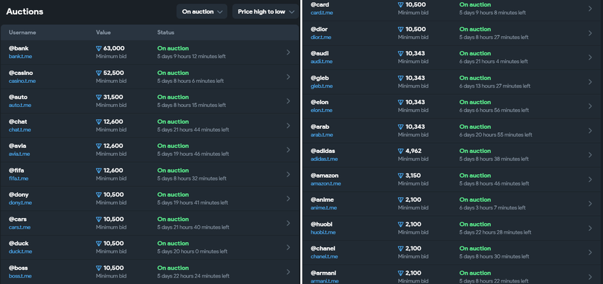 Sie können nur in der Währung Toncoin bieten. Der Benutzername muss mindestens vier Zeichen enthalten. Es gibt bereits einige kurze Namen auf der Seite Fragment. Zum Beispiel @elon, @audi, @fifa, @dior. Ihr Wert liegt zwischen 19.000 und 25.000 $. Das teuerste Los ist @bank. Das Mindestgebot dafür liegt jetzt bei über 100.000 $.