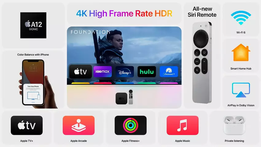 Das Gerät kommt mit Siri Remote (wird über den Lightning-Anschluss aufgeladen). Es ist mit einem Touchpad für eine bessere Steuerung, einer Power-Taste und einer Taste zum Stummschalten des Tons ausgestattet. Das Gerät unterstützt den Sprachassistenten Siri sowie den hauseigenen Spieledienst Arcade.