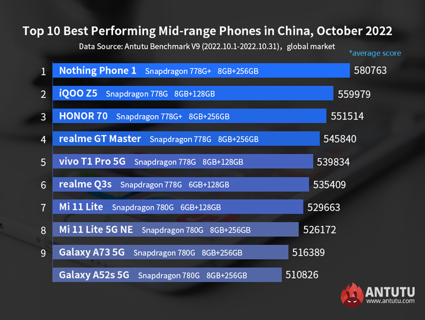 Die Top 10 der Mittelklassemodelle werden vom Snapdragon 778G+-betriebenen Noting Phone (1) angeführt. Es liegt knapp vor dem iQOO Z5 und dem Honor 70. Zu den Top 5 gehören realme GT Master und vivo T1 Pro 5G.