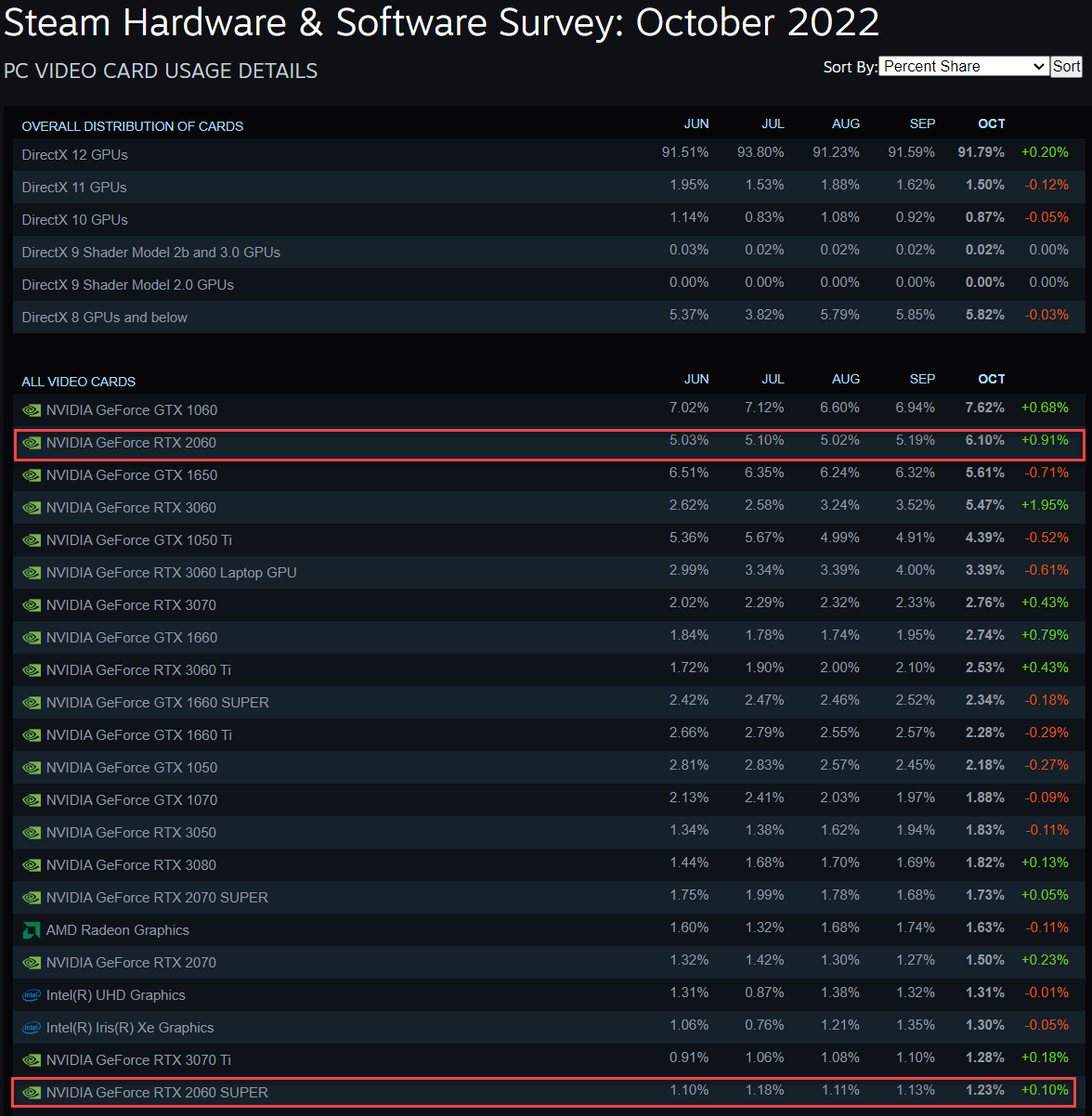 Es sollte angemerkt werden, dass GeForce RTX 2060 sofort eine sehr beliebte Grafikkarte unter den Spielern wurde. Laut Steam-Statistiken, nur GeForce RTX 1060 ist ein beliebter Beschleuniger. Um das gleiche über die RTX 2060 SUPER sagen ist unmöglich, obwohl diese Grafikkarte dank seiner relativ niedrigen Preis ($ 99) fand auch seine Kunden, gewinnen Steam Anteil von 1,23%