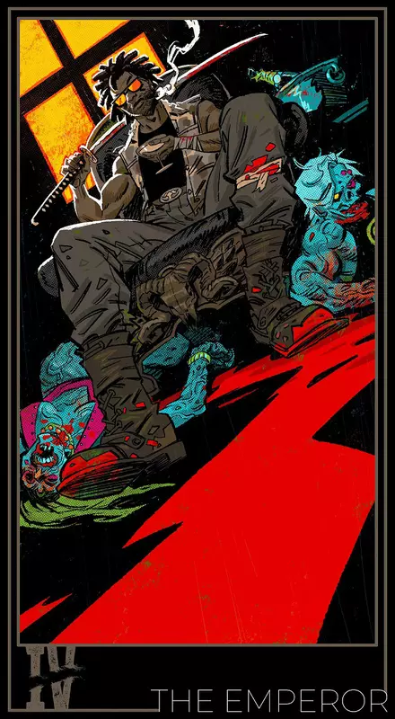 Die auf der Website des Spiels gezeigte "Karte" zeigt ihn mit einem Katana in den Händen und positioniert ihn als Meister des Nahkampfes.