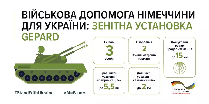 "Zur Verteidigung des ukrainischen Himmels: Seit Beginn des Krieges hat Deutschland der Ukraine 30 Gepard-Flugabwehrkanonen (AAUs) geliefert. Die Gepard hat sich zu einer wirksamen Waffe gegen iranische Shahed-136-Drohnen entwickelt. Sie wird zum Schutz der ukrainischen kritischen Infrastruktur eingesetzt", so die deutsche Botschaft in der Ukraine in einer Erklärung.