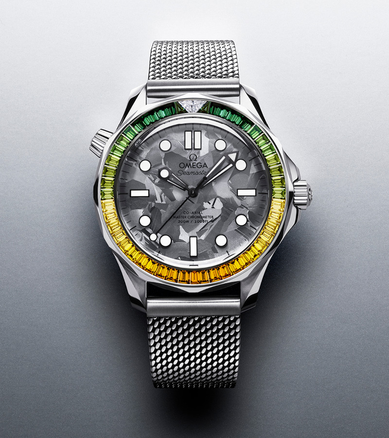 Der Preis der Seamaster Diver 300M 60 Years Of James Bond liegt bei $7600. Aber sagen Sie nicht voreilig "teuer", denn Omega hat eine weitere Canopus-Gold-Version für 140.000 Dollar im Angebot. Hier sind das Gehäuse und das Armband aus einer 18-karätigen Canopus-Gold-Legierung gefertigt, und das Zifferblatt ist von grünen und gelben Diamanten umgeben, eine Hommage an die Farben der jamaikanischen Flagge, in der James-Bond-Autor Ian Fleming ein privates Anwesen errichtete.