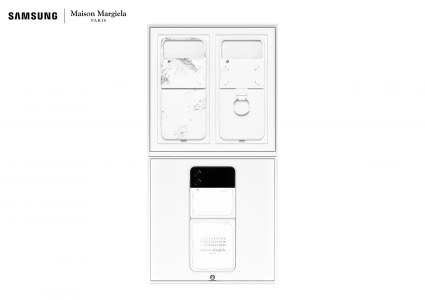 Das Samsung Galaxy Flip 4 Maison Margiela Edition besticht durch seine weiße, matte Farbe und die Maison Margiela-Dekor-Technik. Die Rückseiten sind mit dezenten, durchscheinenden Linien versehen, die auf die internen Schaltkreise des Smartphones hinweisen. Die Neuheit wird mit einer erweiterten Verpackung, einem charakteristischen Maison Margiela-Motiv und in einer speziellen Geschenkbox geliefert.