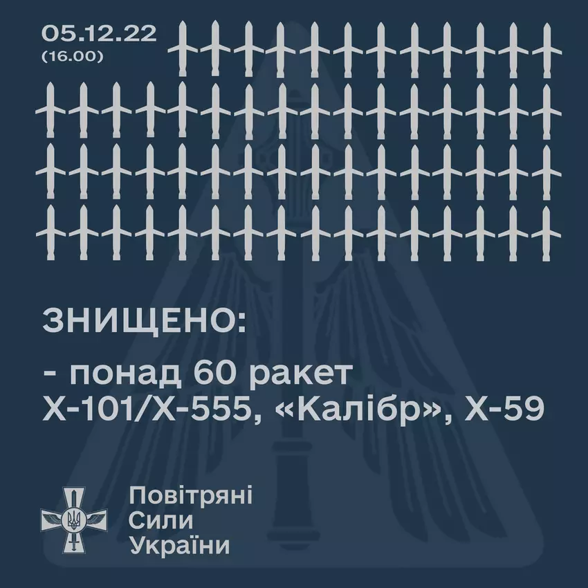 Das Kommando der Luftwaffe der ukrainischen Streitkräfte berichtet, dass die Flugzeuge, die mobilen Feuerteams und die Flugabwehrraketeneinheiten mehr als 60 Raketen abschießen konnten. Damit liegt die Effektivität der Flugabwehr am 5. Dezember bei über 85%.