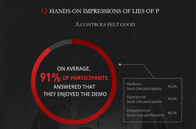 Laut den Statistiken des Entwicklers waren mehr als 90 % der Testteilnehmer von dem Spiel begeistert, und Lies of P gefiel nicht nur den Souls-Fans, sondern auch denen, die noch nie Spiele dieses Genres gespielt haben.