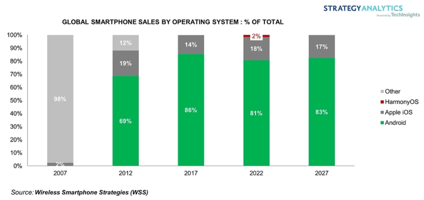 Android ist weiterhin unangefochtener Marktführer bei den mobilen Betriebssystemen - HarmonyOS hat bereits einen Anteil von 2%